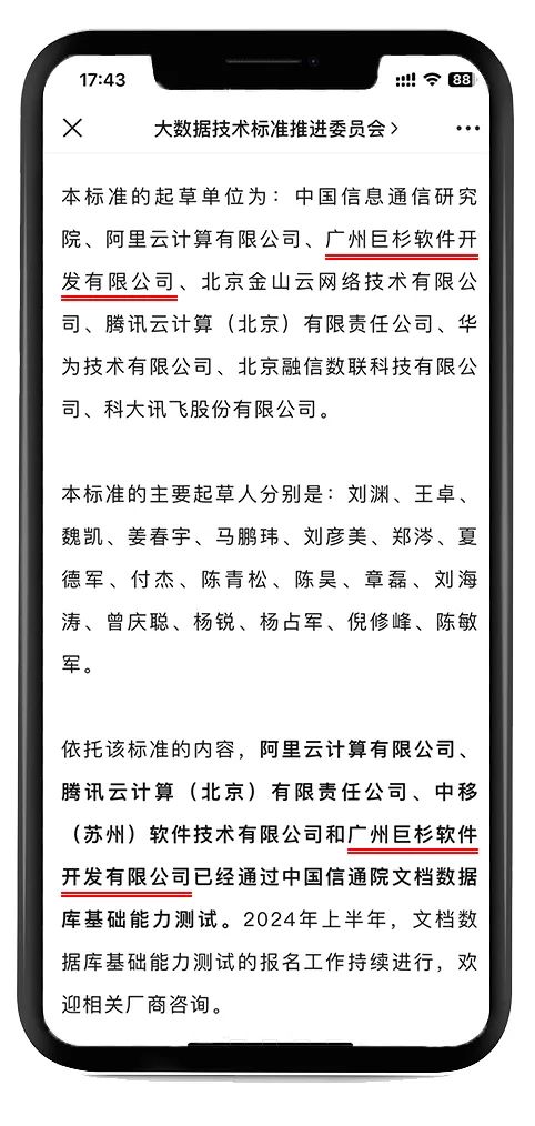 国内首个文档型数据库团体标准发布 巨杉数据库参与制定近日,由中国通信标准化协会批准的《大数据 文档数据库技术要求与测试方法》团体标准正式发布,这是我国首个文档型数据库团体标准,标志着我国文档型数据库迎来了新的发展阶段。巨杉数据库作为国内领先的分布式文档型数据库厂商,参与了本次团体标准的制定,积极承担社会责任与历史使命,为中国文档型数据库的发展贡献力量。此次正式发布的《大数据 文档数据库技术要求与测试方法》(编号:T/CCSA 471-2023),规定了大数据需求场景下文档数据库产品的基本功能、兼容能力、管理能力、高可用能力、分布式能力、安全能力及性能要求。依托该标准的内容,巨杉数据库已首批通过中国信通院文档数据库基础能力测试。巨杉数据库携手广发证券入选2023大数据“星河”案例近期,中国信息通信研究院、中国通信标准化协会大数据技术标准推进委员会(CCSA TC601)连续七年共同组织的大数据“星河(Galaxy)”案例征集活动发布公示。本次征集活动,旨在通过总结和推广大数据产业发展的优秀成果,推动大数据在社会生产生活中的应用, 促进大数据技术产品及相关产业发展。巨杉数据库与广发证券联合申报的“广发证券消息中心基于分布式文档型数据库的改造研究”入选数据库优秀案例。近期,胡润研究院与广州南沙联合发布《2023胡润全球猎豹企业榜》,这是胡润研究院首次发布“全球猎豹企业”。榜单列出了全球成立于2000年后,五年内最有可能达到独角兽级十亿美金估值的高成长性企业。巨杉数据库凭借在分布式文档型数据库领域的创新突破,成功入围《2023胡润全球猎豹企业榜》,本次入围是对巨杉数据库的行业领导力、创新力、发展潜力与投资价值的认可。