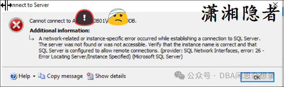 如果SQL Server AlwaysOn的实例设置隐藏实例后,手动故障转移时,你可能连接不到辅助节点。此时你可能遇到下面错误(这里的测试环境为SQL Server 2019, Tcp端口设置为静态端口14033):SQL Network Interfaces, error: 26 - Error Locating Server/Instance Specified