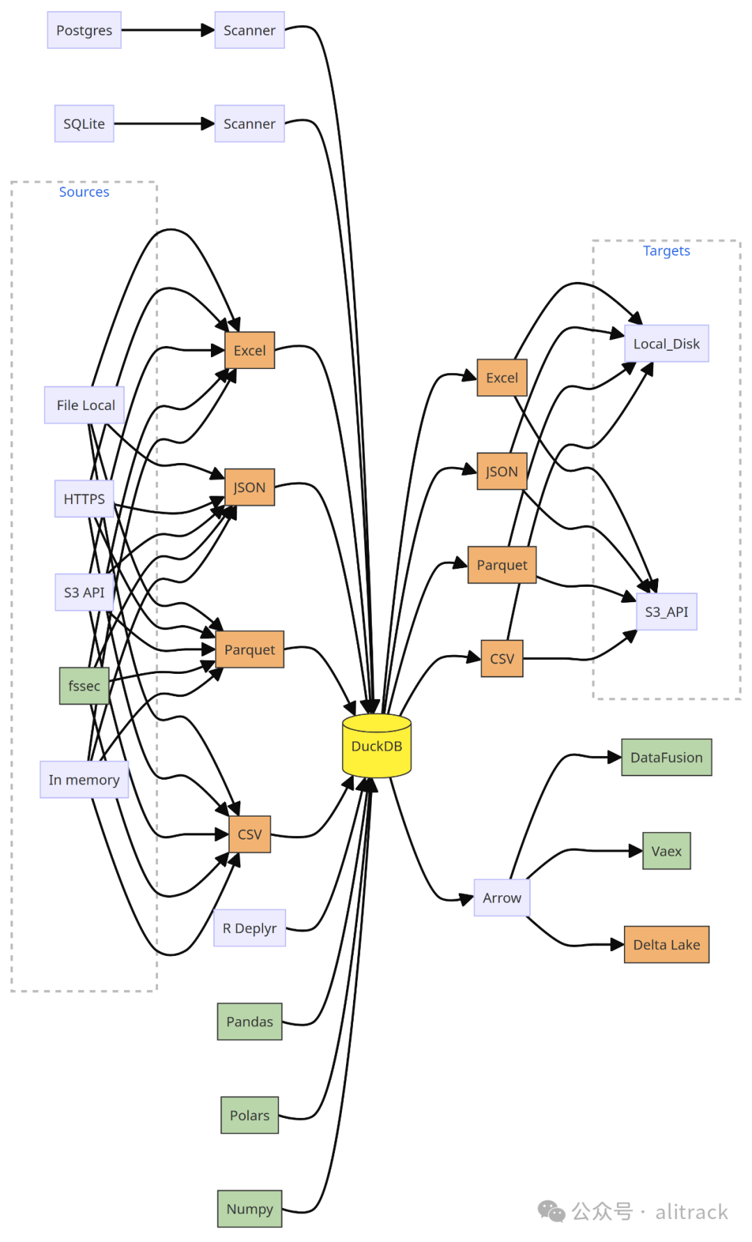 2. 详细:流程图中包含了多种数据格式(如 Excel、JSON、Parquet、CSV)和数据库(如 Postgres、SQLite),以及 DuckDB 支持的多种数据操作工具(如 R dplyr、Pandas、Polars、Numpy)