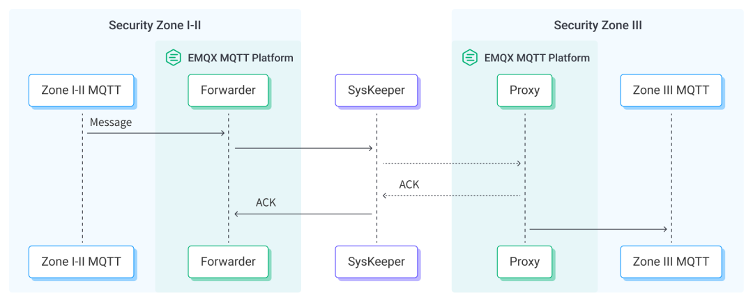 EMQX 在数据集成中新增了正向网闸 SysKeeper 2000 穿透功能,通过配置可以启用此功能,进行 EMQX 消息在不同生产区之间的桥接传输。这一功能确保符合规章制度的情况下,实现了两个生产区之间数据通信,为电力行业物联网应用落地提供了定制化的支持,助力电力系统的安全、高效运营。