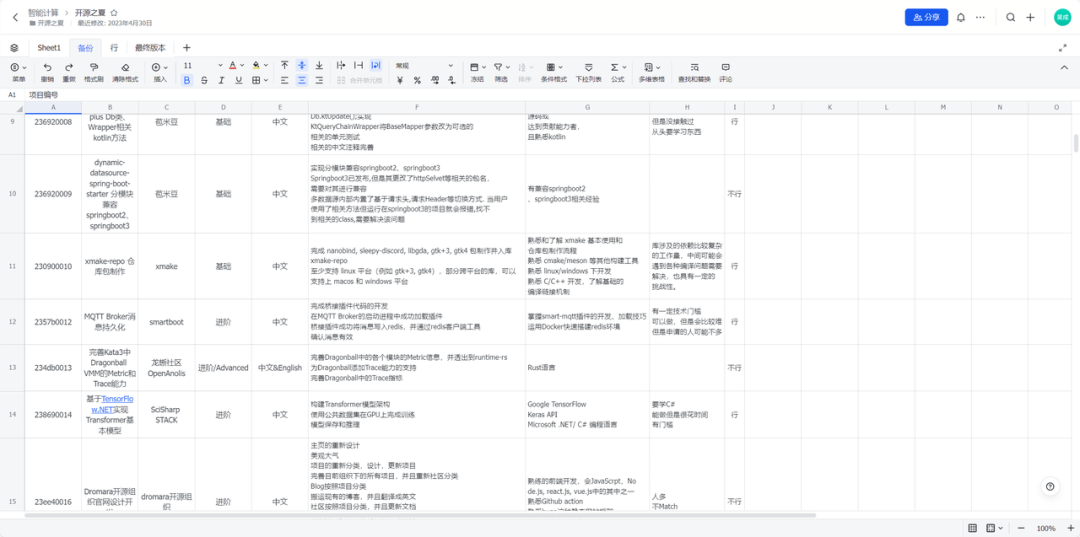 个人而言,在移动端或者桌面端编辑后,它可以随时随地查看和编辑文档,方便我查看或者修改计划。我平时梳理知识、对比选择,或者做一些日程安排,会用到飞书文档。因为它提供丰富的模板,如表格我会用来对比项目选择的好坏,思维导图用来梳理知识等。下面是我当时挑选项目时,记录的各个项目的社区、技术栈、对我而言的开发难度以及最后的评价。最后,我综合分析做出选择。