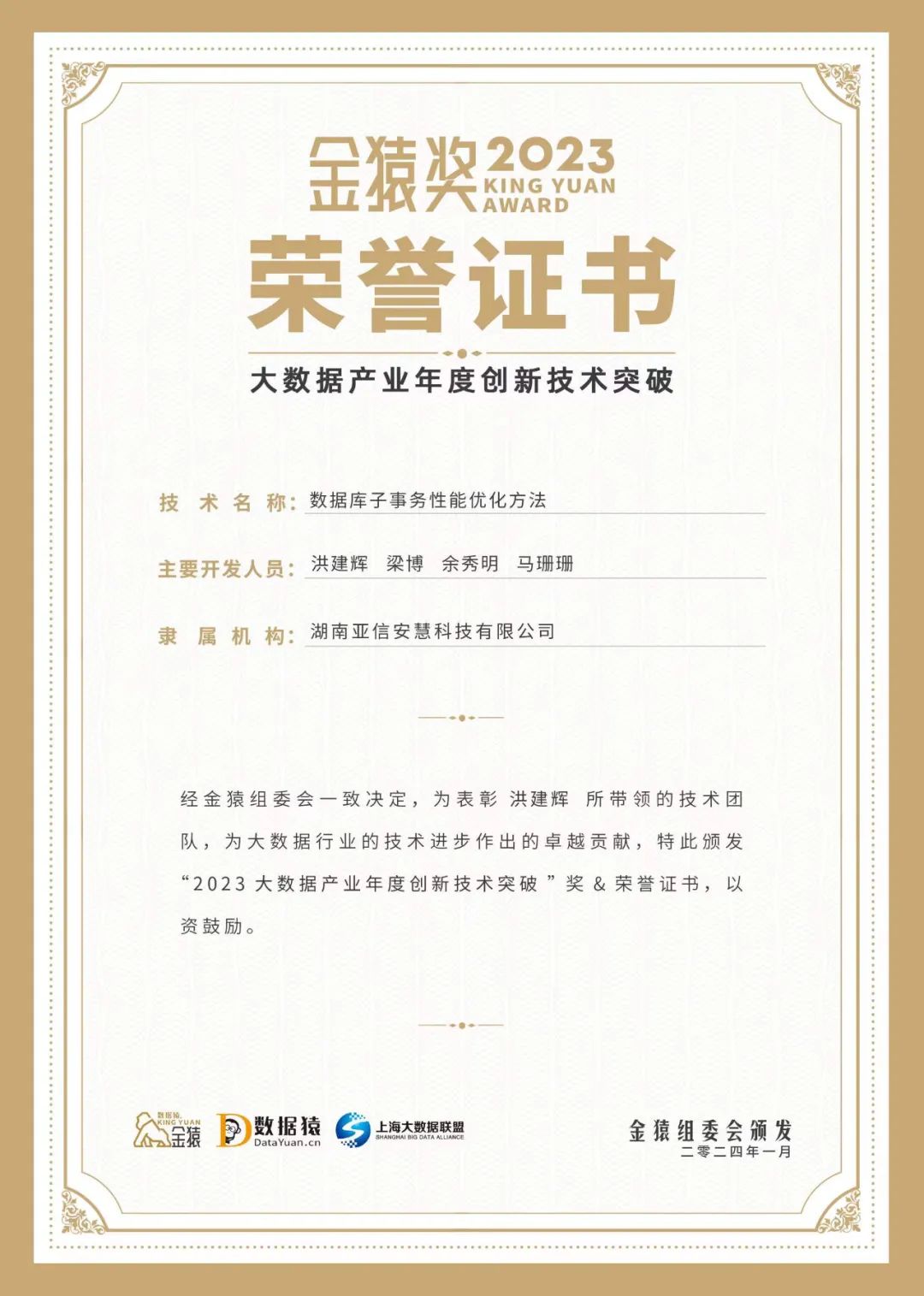 图2:“2023大数据产业年度创新技术突破”荣誉证书
