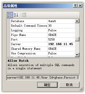 在“添加连接”对话框上输入所需信息的步骤是为新建连接生成连接字符 串,如果需要添加额外的连接参数,可以点击高级按钮后在“高级属性”窗口 中选择,如下图 9-5 所示。每个参数的含义请参考 5.1.1 连接字符串章节。