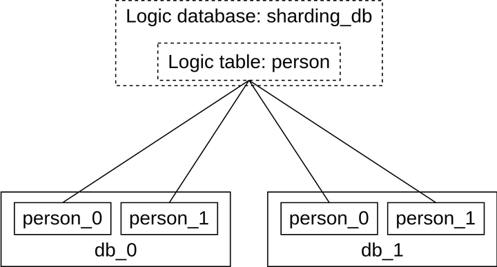 以下图为例,在 ShardingSphere-Proxy 中配置逻辑库 sharding_db 和逻辑表 person,Proxy背后实际对应了 2 个数据库共 4 个表。