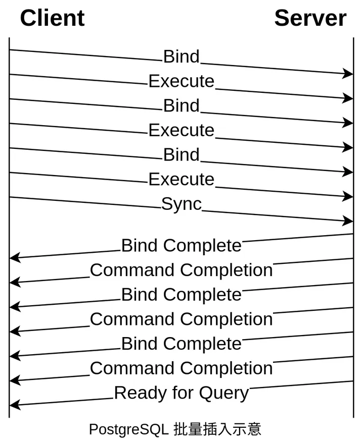 ps.executeBatch();在 PostgreSQL 协议层面,Bind 消息每次能够传递一组参数形成 Portal,Execute 每次能够执行一个 Portal。执行批量插入可以通过反复执行 Bind 和 Execute 实现。协议交互示意图如下: