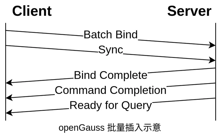 Batch Bind 是 openGauss 特有的消息类型,相比原本的 Bind,Batch Bind 一次能够传递多组参数,使用 Batch Bind 执行批量插入的协议交互示意如下: