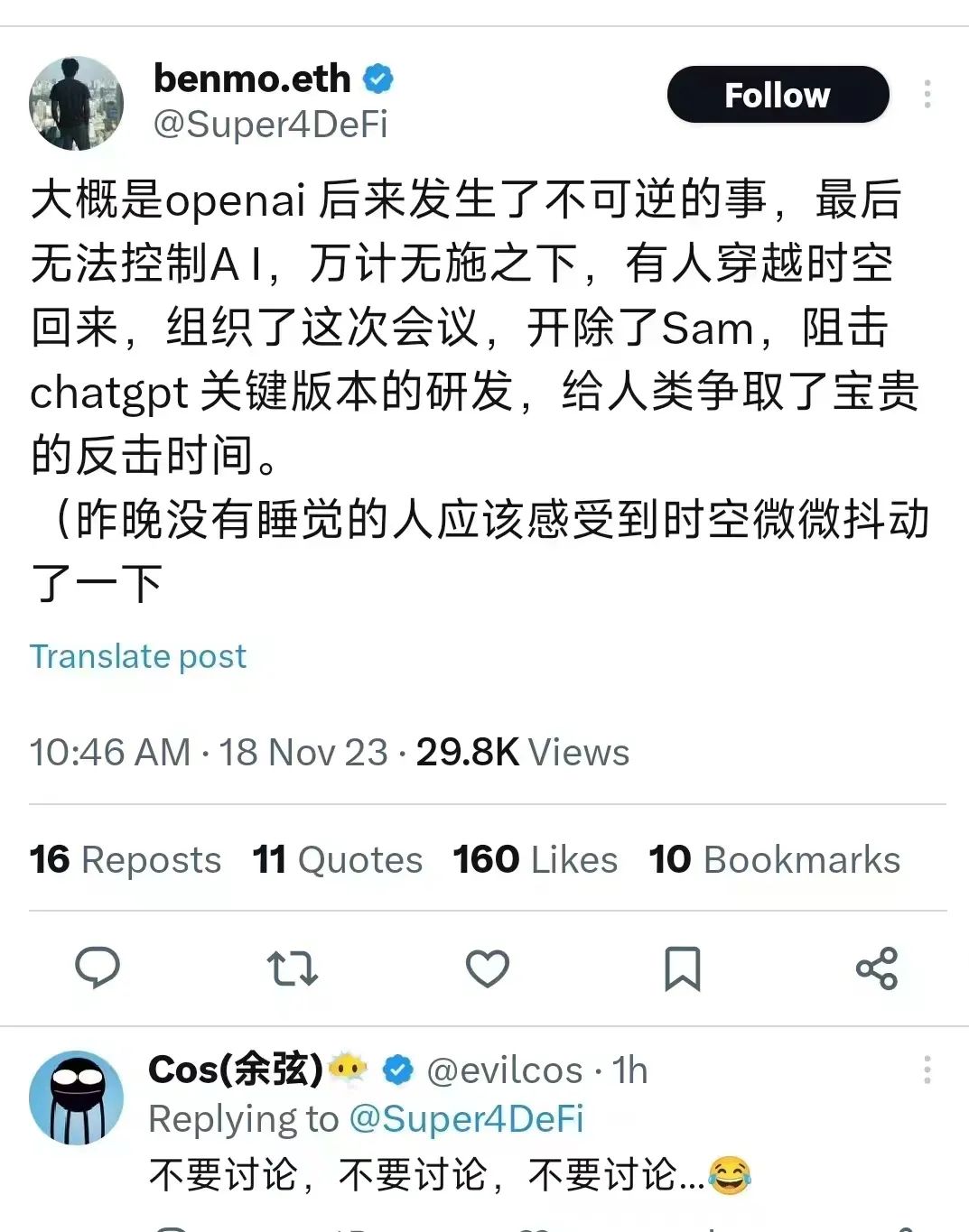 图源:https://en.wikipedia.org/wiki/Sam_AltmanOpenAI 自成立之初,就和微软保持着亲密的关系。而微软也贯穿着整个 OpenAI 的政变。这场内斗持续了 5 天,个中曲折来回不在此展开。值得一提的是,伴随着这场内斗,互联网上流传着这样一个段子:可见,大众对技术的敬畏愈加深刻,而这一代入局者,凭借着对科幻及宇宙的好奇与探索,也会将科技推向更为猛烈的发展进程。回到 OpenAI 的政变,11月22日这场内斗迎来了大结局,OpenAI 官方推特宣布,Sam Altman 正式重返 OpenAI 并担任首席执行官。好在经此一战,AI 对齐和 AI 安全的话题愈加得到重视,而这也必将影响着未来人工智能的发展。
