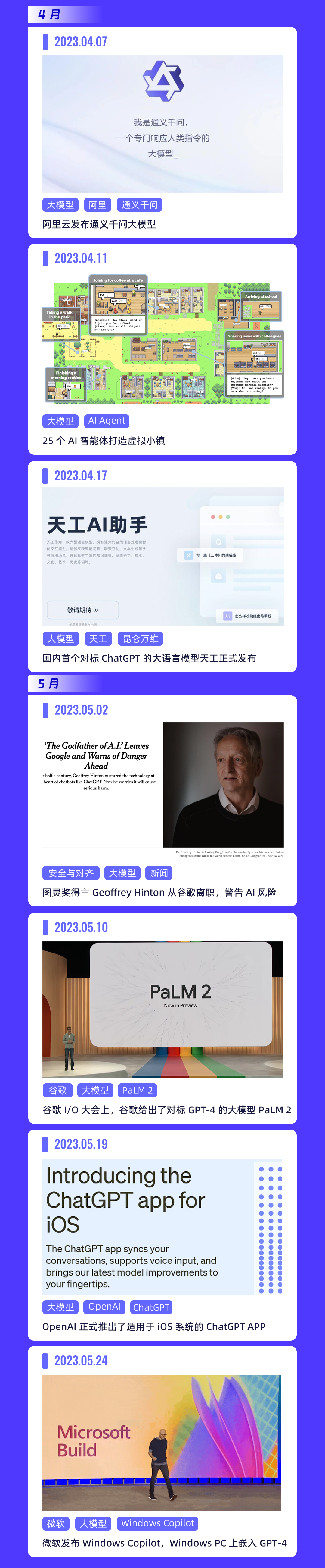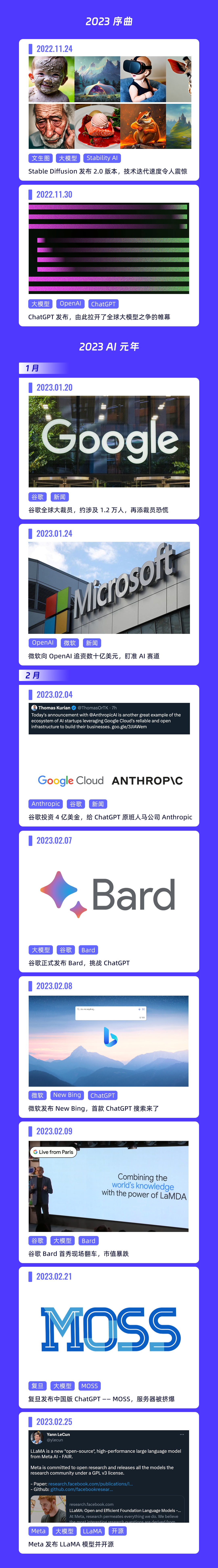 这些话题的热烈讨论从 2022 年底延续至今,并将继续延伸到更远的以后。作为 AI 行业的从业者,我相信 AI 这一年的发展一定会被铭记在历史中。每一个小小里程碑的成就逐渐聚沙成塔,而汇成这条历史长河的每一粒沙,都值得被记录和书写。本文汇总了 2023 年人工智能发展的诸多大事件,意在记录 AI 元年的发展与起伏,更希望连点成线,可以窥见更远的未来。