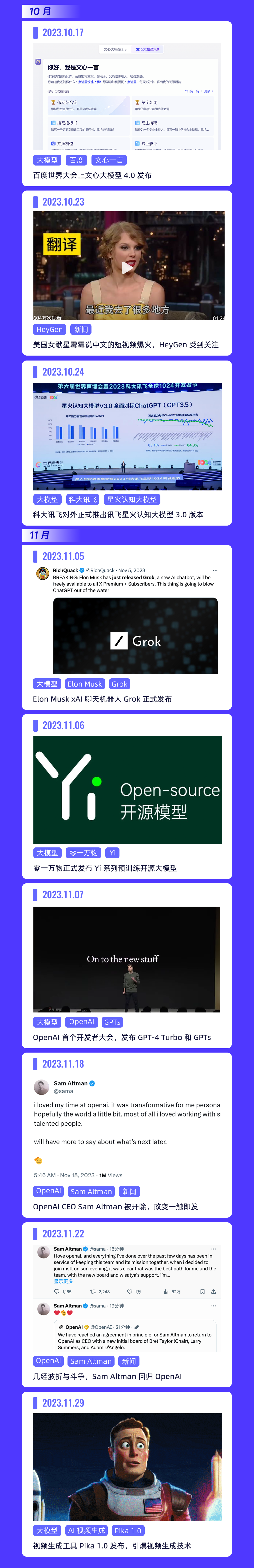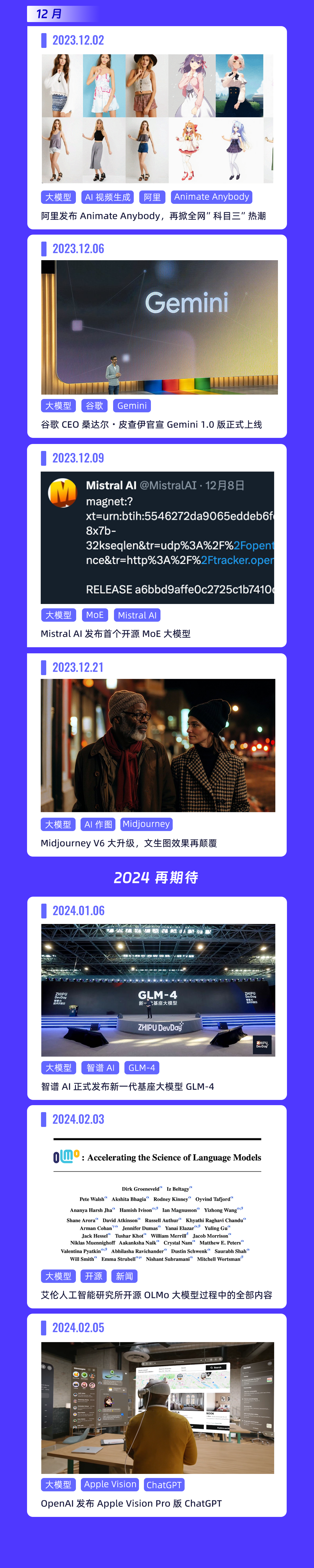 2023 年年底,Google 终于发布了大动作,Gemini 1.0 正式上线。作为互联网时期的巨头,Google 这一年都处在风口浪尖之上,不幸的是,模型上线后的效果不及预期,再度让人唏嘘。不过,这一次大众不再悲观,而是继续期待着 Gemini Ultra 的面世。2023 年年底又点燃了两把火:视频生成和 MoE。Pika 1.0 的发布,带来了极为震撼的视频效果。Mistral AI 发布的首个开源 MoE 大模型,为大模型训练带来了新的思路和尝试。来到 2024 年,OpenAI 发布的 Apple Vision Pro 版 ChatGPT,打造了一个更自然、更直观、更沉浸的互动方式,重绘人类与 AI 的未来互动图景。这个日渐垒起的 AI 技术高楼,不知何时会“手可摘星辰”。我们期待着 2024 给出答案。