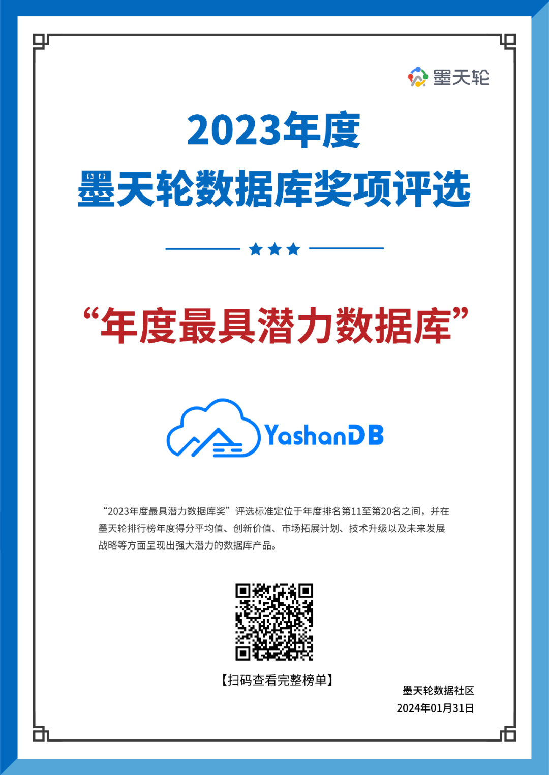 2023年度IT168技术卓越奖榜单正式揭晓,YashanDB共享集群数据库管理系统凭借创新的架构突破荣获”年度创新产品奖”,充分彰显了YashanDB在数据库技术领域的卓越表现和引领作用。