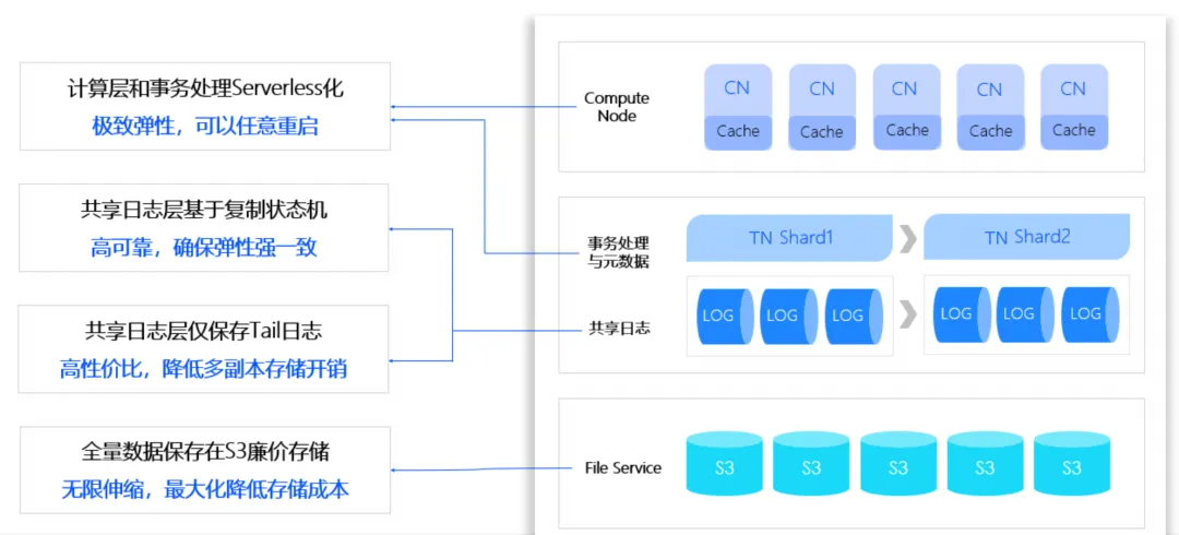 - 计算层 :以计算节点 Compute Node(简称 CN)为单位,实现了计算和事务处理的 Serverless 化,具备自己的缓存,可以任意重启和扩缩容。