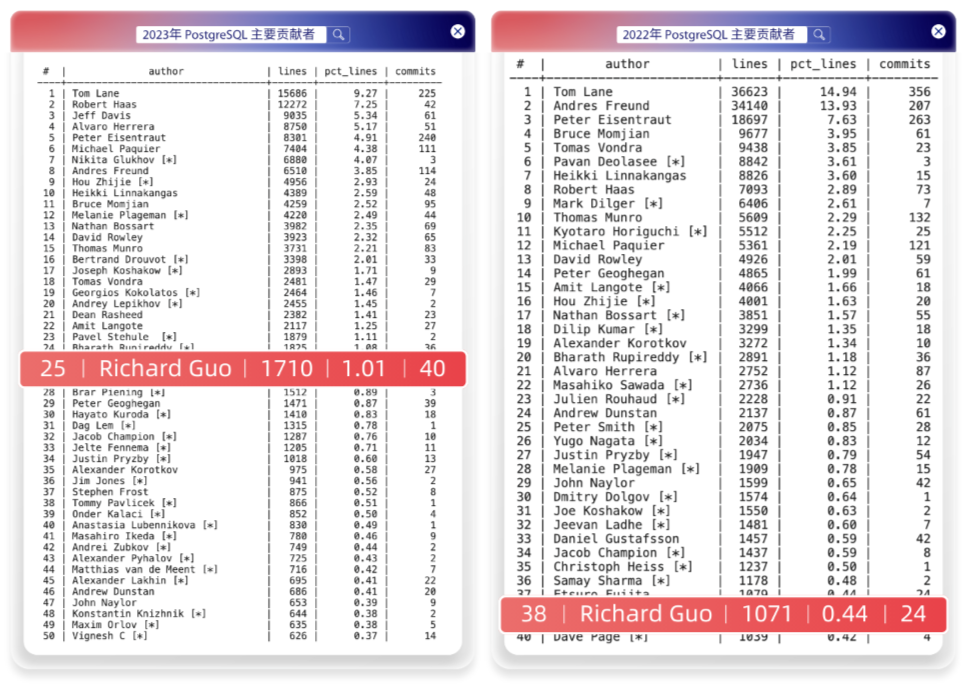 在 Robert 的统计中,2023 年,Richard 为 PostgreSQL 贡献了 1710 行代码,提交了 40 个 Commits,在名单中排名 25 名。2022 年的统计[3]中,Richard 同样荣登代码主要贡献榜单,以 1071 行代码,24 个 Commits,在 40 名主要代码贡献者中排名 38 名。由于 Robert 的统计数据仅包括 Commits 所涉及的第一作者(Principle Author),Richard 的贡献量远不止这些。经统计,Richard 在 PostgreSQL 16 版本中参与的 Commits 数为 118。除了 Richard,拓数派多位研发同事均对 PostgreSQL 多个版本做出了代码贡献,尤其是在 PostgreSQL 16 发布中,共有 33 名贡献者来自中国,而拓数派占据其中 5 席,并以接近一半的 Commits 次数在国内独占鳌头。