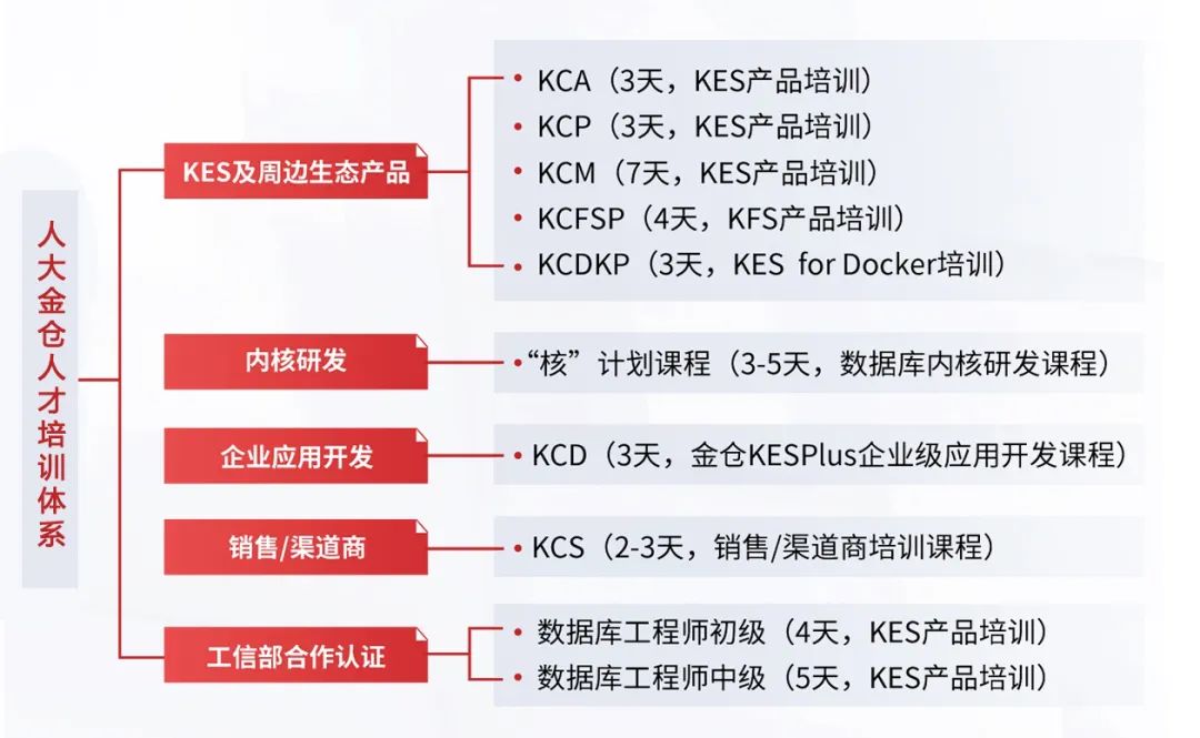 作为人才自主培养落地主体,人大金仓人才发展中心坚持:强基固本,立德树人理念。依托金仓20多年沉淀的理论基础和应用实践经验,以及在过去4年积累的丰富人才培养经验,构建了5大类10门课程的人才培养体系,全方面满足社会上人才生态培养/金仓人力培养的需求。