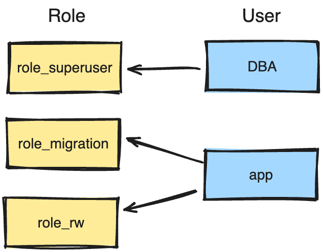 设置单独 migration 用户的原因一方面是为了方便监控,另一方面也使得我们可以给 migration 用户设置单独的默认连接参数,最常见设置的是 lock_timeout。要设置的原因是,做 DDL 时要加锁,加锁需要等待,而因为 PG 的队列机制,即使后面来的另外一条事务不需要 DDL 锁,一样会被 block 住。所以 migration 用户往往要设置一个 lock_timeout,避免长时间 block 后面的其他事务。 在 Postgres 里创建对象时,比如建表,建出来表的 owner 就是建表语句的执行者。所以当使用一个单独的 migration 用户来做 schema 变更时,表的 owner 也会是 migration。如果希望 owner 能反应具体的业务,比如说 payment 的话,那么可以再单独创建一个 payment 的角色,在 migration 执行的时候,使用 SET LOCAL ROLE 切换到 payment 再执行。