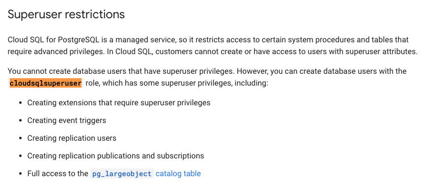 公有云数据库服务是不提供 superuser 的,他们只提供一个阉割版的 superuser,比如 Google Cloud SQL 里的 cloudsqlsuperuser