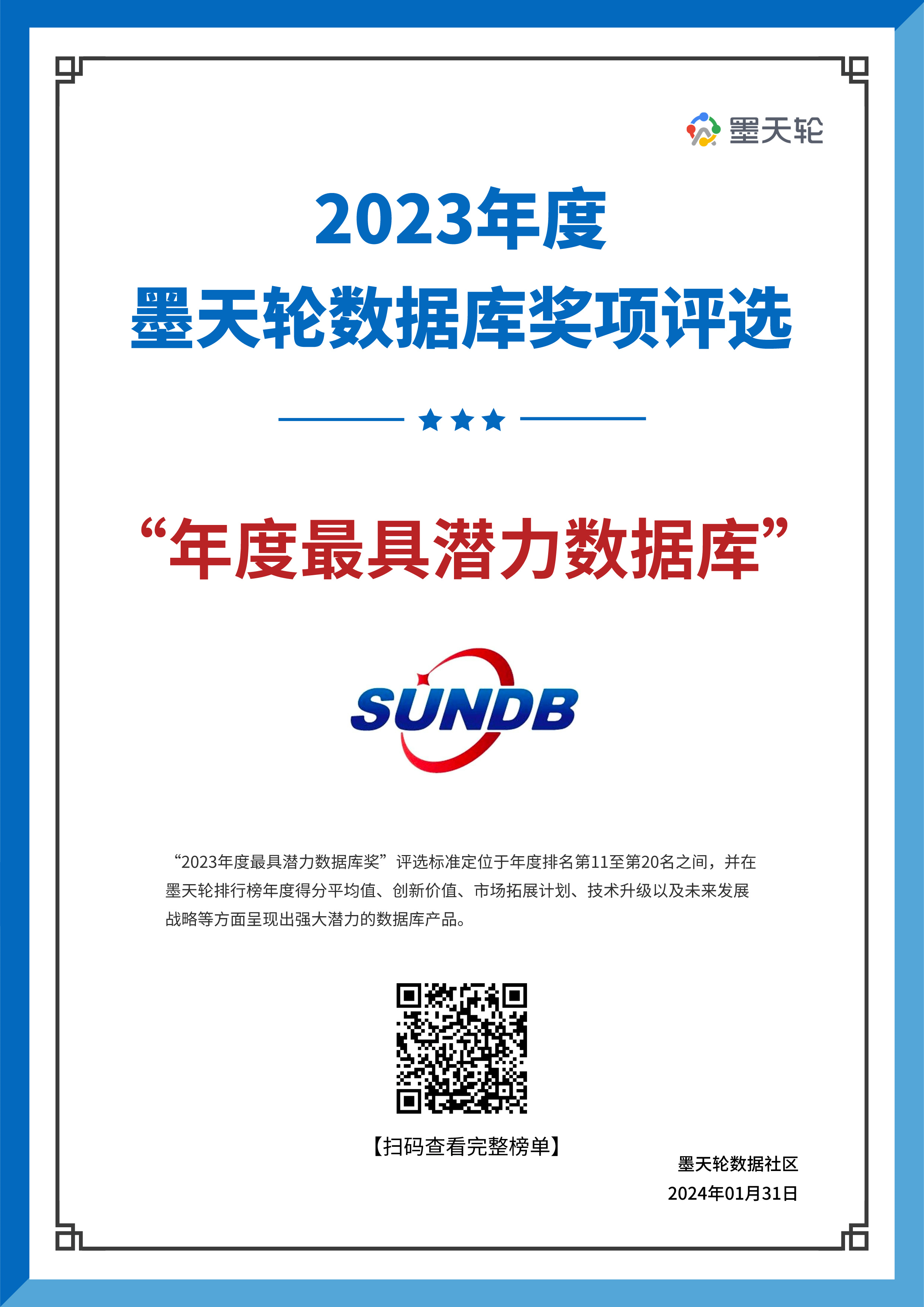 近日,墨天轮社区发布《2023年度数据库评选获奖名单》。基于技术创新与研发能力、知识产权数、应用领域及市场份额、高校合作、生态建设等近 50 个中立指标进行综合评估遴选,科蓝软件SUNDB数据库凭借在法律层面拥有高度自治权和自主掌控权以及与清华大学成立联合研究院等突出优势斩获“2023年度最具潜力数据库奖”。