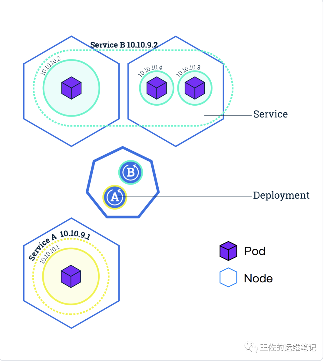 下图中有两个服务Service A(黄色虚线)和Service B(蓝色虚线) Service A 将请求转发到 IP 为 10.10.10.1 的Pod上, Service B 将请求转发到 IP 为 10.10.10.2、10.10.10.3、10.10.10.4 的Pod上。
