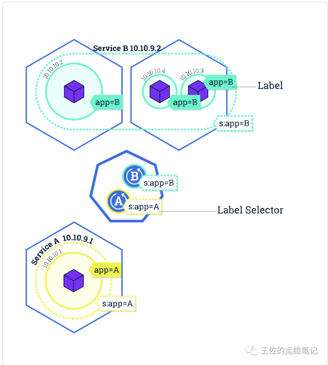 Deployment B 含有 LabelSelector 为 app=B 通过此方式声明含有 app=B 标签的 Pod 与之关联