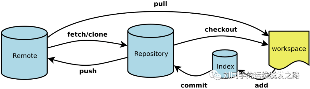 Workspace:工作区Index / Stage:暂存区Repository:仓库区(或本地仓库)Remote:远程仓库