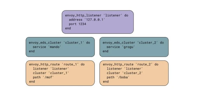 在 Chef 内部,配置是一个 Singleton,模拟了每个主机只有一个 Envoy 配置。所有的 Chef 资源都在该 Singleton 上运行,添加了监听器,路由或集群。在chef运行结束时,envoy.yaml会被生成、验证,然后安装:我们永远不会编写中间配置,因为它们可能是无效的。