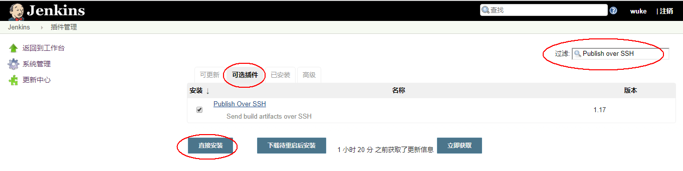 --选择可选插件-->过滤Publish over SSH-->选中并点击直接安装