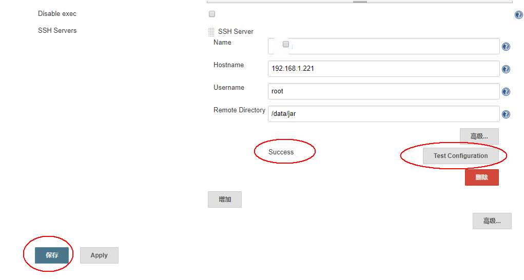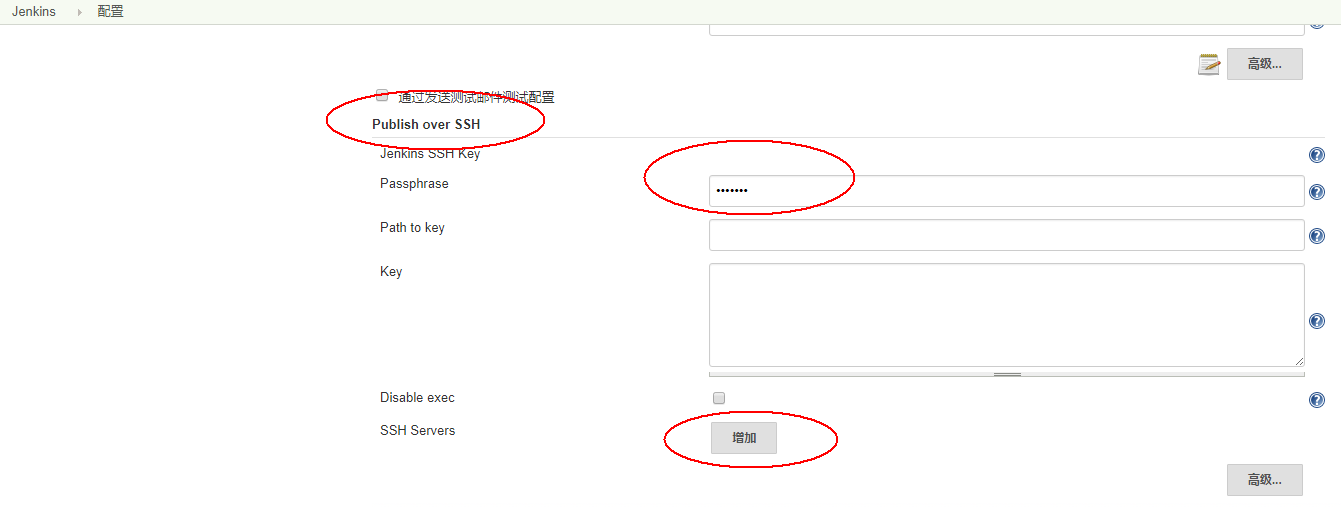 --Publish over SSH-->在Passphrase填写部署jenkins服务器的登录密码-->并增加新的远程服务器