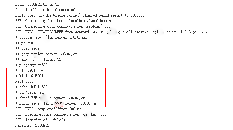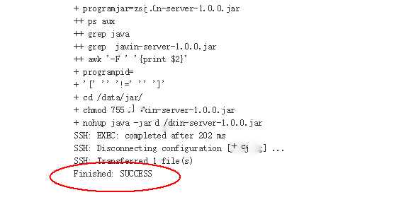 确保SSH:输出Transferred 1 file(s):证明该服务jar包以正确发送至目标服务器