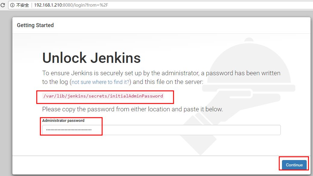 开始界面提示获取密码命令,在命令行执行,复制初始密码--粘贴--continue