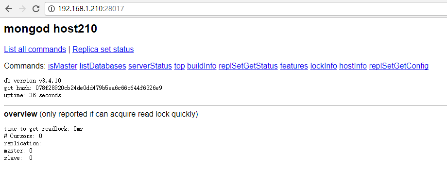启动后,默认的web管理端口是28017,这时候访问http://ip:28017即可看到管理界面