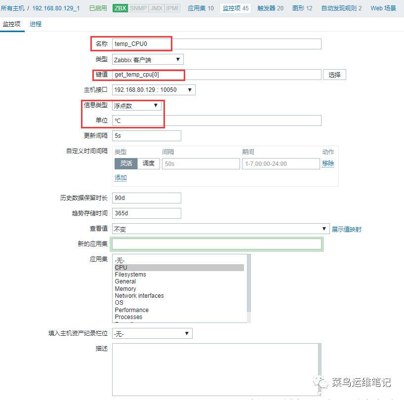[root@localhost ~]# vim /etc/zabbix/zabbix_agentd.confUnsafeUserParameters=1UserParameter=get_temp_cpu[*],sensors|grep "temp1" |cut -c 16-1