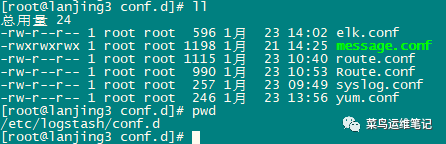 cd /etc/logstash/conf.dvim syslog.confinput {syslog {type => "system-syslog"port => 10514}}output {stdout {codec => rubydebug}#elasticsearch {# hosts => ["192.168.200.128:9200"]# index => "system-syslog-%{+YYYY.MM}"}}