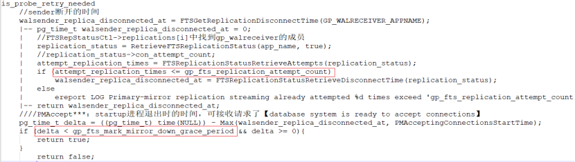 2)到达streaming状态前重启次数>gp_fts_replication_attempt_count时(重启次数太多了,需要看此时距离最开始的时间),此时距离接收连接时过了deta2时间 <= gp_fts_mark_mirror_down_grace_period则需要重试;否则不重试,反馈master后标记mirror down
