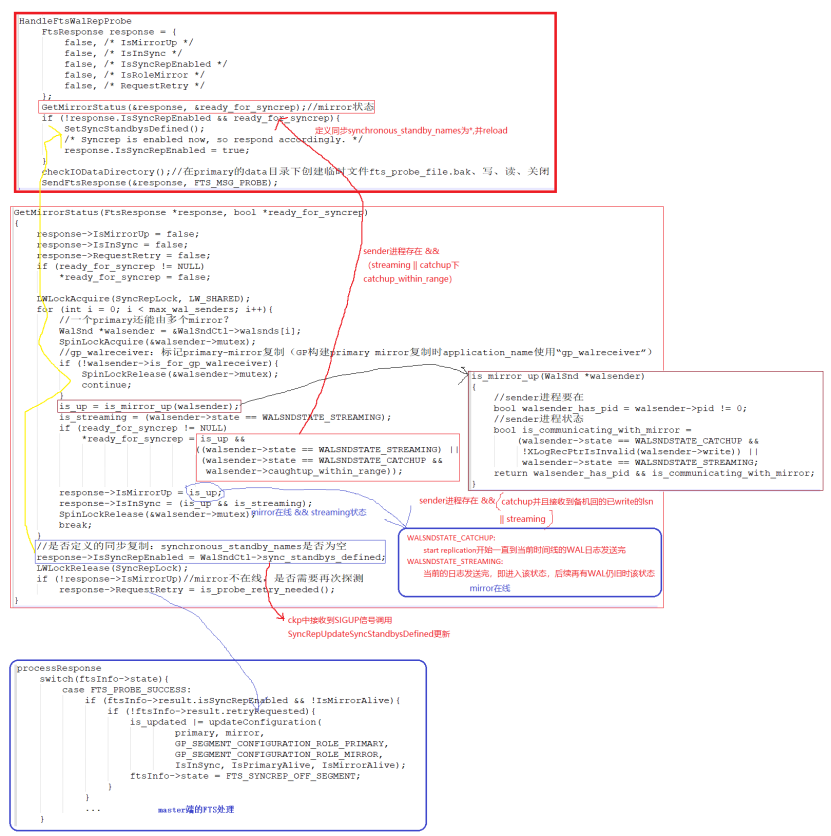 2)IsMirrorUp并且sender处于streaming状态或caughtup_within_range状态,则HandleFtsWalRepProbe函数定义synchronous_standby_names为*即开启同步