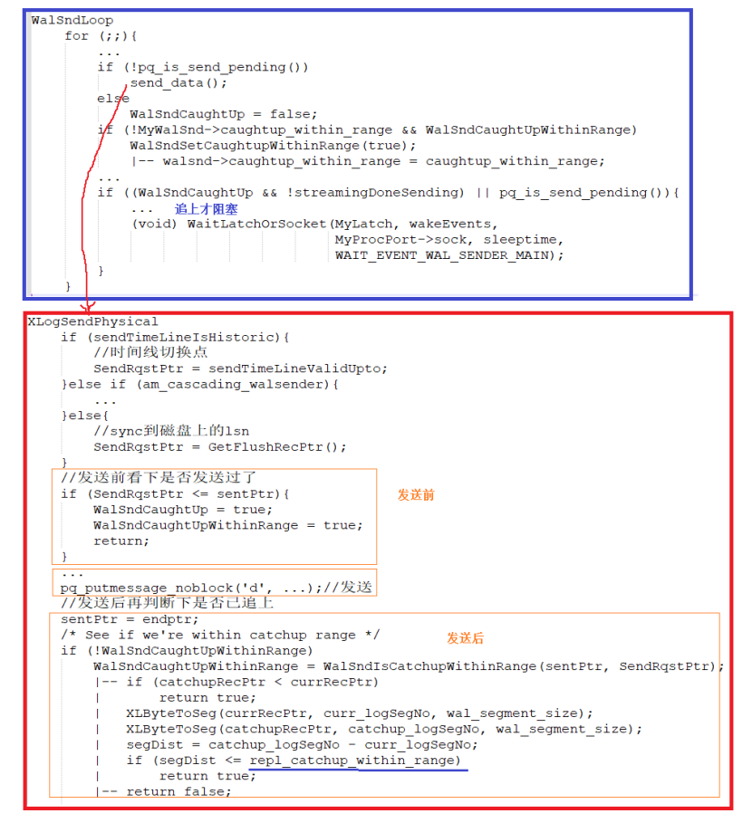 1)XLogSendPhysical发送WAL日志发送后WalSndIsCatchupWithinRange判断是否追上:若当前已sync到磁盘的WAL所在文件号 - 当前已发送的WAL所在段文件号 > repl_catchup_within_range,则WalSndCaughtUpWithinRange为false,否则为true。