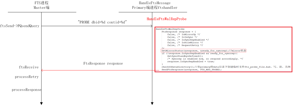 3)HandleFtsWalRepProbe函数得到primary和mirror状态后,通过SendFtsResponse将状态FtsResponse发送给master端的fts进程