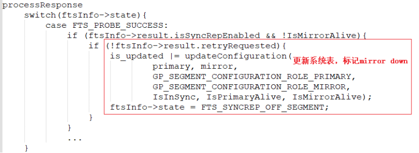 3)Master端fts进程接收探测反馈后:若不在重试,则更新gp_segment_configuration系统表,标记mirror down