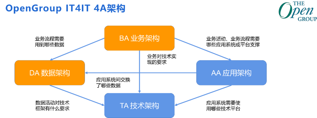 4A架构即BA业务架构、DA数据架构、AA应用架构、TA技术架构。现在很多企业都成立企架办(企业架构办)专门提供企业架构的管控和服务。AA应用架构和TA技术架构企业过去几年提的比较多,如:SOA,微服务架构等。而BA业务架构和DA数据架构是很多企业欠缺,却是数字化转型中最关键的部分。