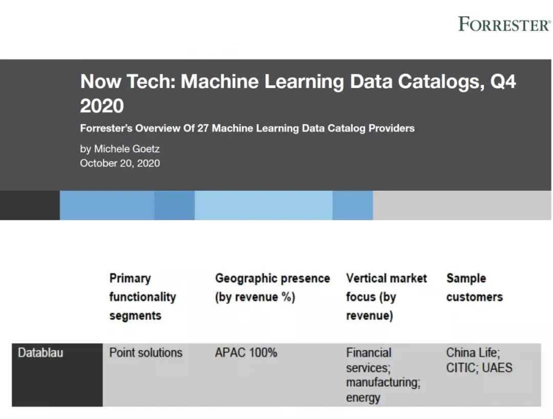凭借众多商业化落地案例,深厚的技术积累,完善的全栈企业级产品,Datablau数语科技问鼎Forrester NowTech全球MLDC(基于机器学习的数据资产目录),是亚太区域唯一入选的厂商。