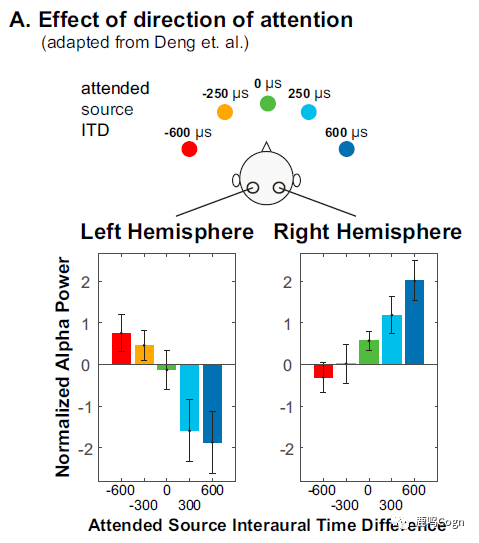 图1A 听觉空间选择性注意过程中的alpha偏侧化。通过控制双耳时间差(用μs衡量),听觉空间注意被导向五个不同的方向。在听觉线索(cue)出现之后、听觉刺激呈现之前的这段时间里,被试的alpha能量表现出明显的偏侧化。对于在左边的听觉线索,同侧顶叶alpha能量上升,对侧alpha能量下降;对有变的听觉线索的反应则相反(Deng et al., 2020; Neuroimage)。