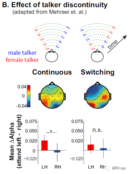 图1B 当说话者不连续时,alpha偏侧化会被干扰。上方左边是连续的声音流,右边则是存在切换(switching)的不连续声音流。脑电地形图展现了关注左边减去关注右边后的结果,结果发现在连续条件下存在alpha偏侧化,而切换条件下不存在。