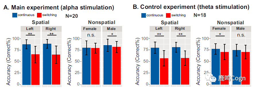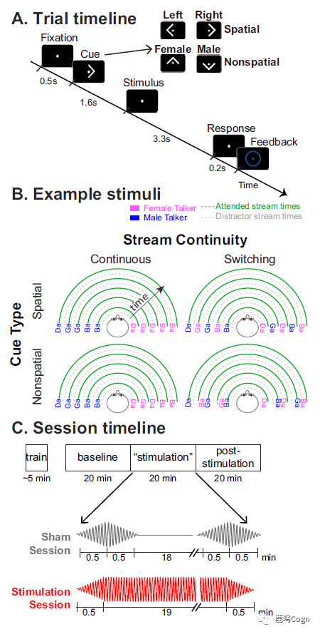 因此,本研究使用HD tACS对此进行探索,目的是发现顶叶alpha可以因果性地影响听觉空间注意表现。任务如图2A所示,包括让被试关注位置信息(location; 涉及空间注意)或关注说话者的性别(不涉及空间注意,与顶叶alpha无关);此外,如图2B所示,声音刺激一半是连续的,一半是不连续的(不连续会破坏顶叶alpha)。根据之前的推断,研究者假设,alpha-tACS对于非空间注意任务条件和不连续的任务条件没有影响,只对涉及空间注意的连续的听觉注意有影响。