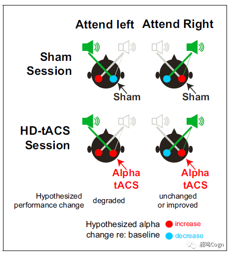 以往关于视觉注意的研究表明,顶叶alpha振荡和视觉空间注意是存在因果关系的。这些研究利用alpha频率的经颅磁刺激(TMS)来调控顶叶的alpha振荡,发现这种刺激可以提高对同侧目标的注意或记忆,同时降低对侧目标的注意或记忆。而在另一种神经调控手段:经颅交流电刺激(tACS)中,似乎只有高密度tACS(high-density; HD tACS)有用。不过,在听觉空间注意方面还没有类似研究。