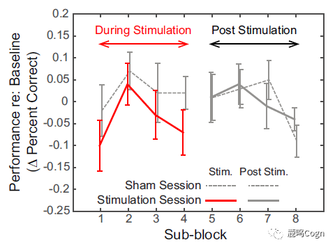 之后作者进行了一个事后分析,对stimulation block和刺激后block都分成了四段,来看tACS效应对于左侧刺激影响的时间变化。结果发现了一个持续稳定的刺激效应(图6),在stimulation block中,真刺激条件下的表现都差于sham条件;而在刺激后block中,这种效应就消失了。
