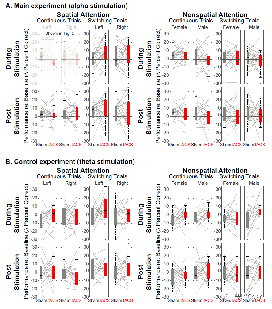 整个实验流程包括两个session(图2C),一个是真alpha-tACS的刺激,另一个是虚假刺激(sham)。每一个session都是三个20分钟的block,首先是基线block,然后是"stimulation" block(接受刺激的时候完成),最后是刺激后(post-stimulation)block。除了这个主实验之外,研究者还做了一个控制实验,把alpha-tACS换成了与空间注意关系不大的theta-tACS (6 Hz),其他都不变。