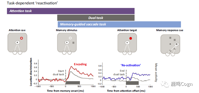 图1 (C)双任务MGS示意图:将MGS记忆任务结合了注意任务。尽管一开始的位置信息编码是稳健的(红线),内容特异性活动会被双任务阶段所干扰。此外,这种位置特异性信息会在双任务的结束部分重新被唤醒(蓝线)。