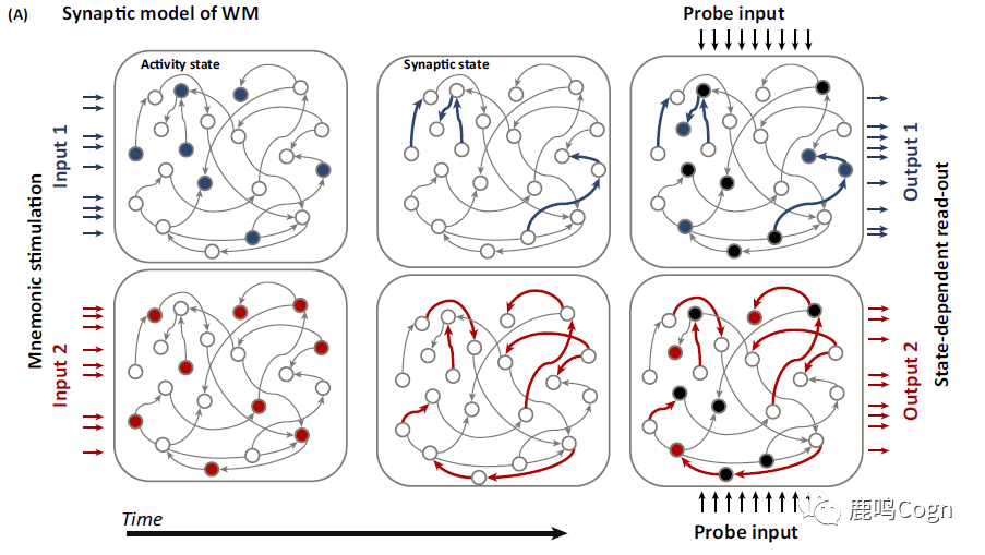 图2A 工作记忆的突触模型。左边的蓝色和红色箭头代表两种记忆输入,记忆刺激输入之后会驱动一种刺激特异性的活动状态(实心圆点),然后触发细胞间短期突触可塑性的特定模式(粗箭头)。在记忆提取的时候,记忆通过情境相关反应从突触痕迹中读取出来(黑色的圆点)。探测刺激(probe)驱动的反应将由突触模式这种隐藏状态形成可识别的输出模式(右箭头)。