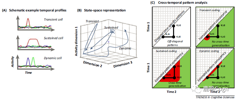 图3 神经动态编码的示例(A) 在单细胞层面,假设有三种不同的时间编码细胞,分别是瞬态(transient)、持续性(sustained)和动态(dynamic)细胞。颜色代表了不同的实验条件。(B)在多维的活动状态空间(每个轴代表一个神经元的活动),可以利用轨迹来表示三种不同神经元的时间动态变化模式。(C)可以利用跨时域模式分析来表示时间动态。