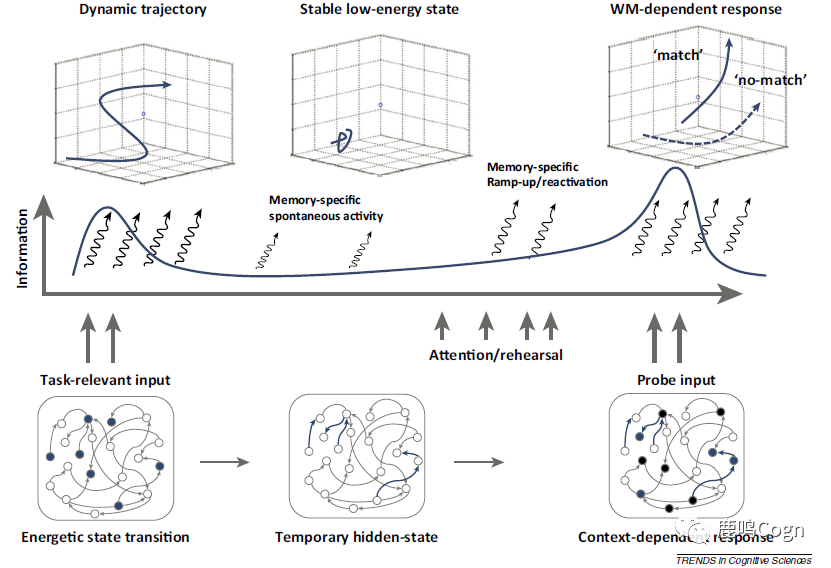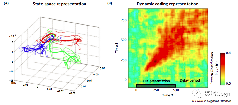 图4 在猴子PFC中,WM动态编码的证据。(A)降维之后的活动状态空间表示出每个记忆条件(不同颜色表示)的动态活动轨迹;(B)跨时域分析可以看出,存在很强的WM特异性活动(简单而言就是对角线的generalization很强,非对角线相对弱)。注:这张图已经至少在三篇推送中出现过,除了上面提到的,还可参考:最新综述 | 平衡工作记忆中的灵活性和干扰)。