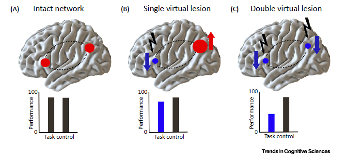 按:本文介绍一篇关于认知网络功能代偿的文章。这篇文章主要从网络角度探讨了一个问题:当使用经颅磁刺激(TMS)对特定脑区造成"虚拟损伤"后,该网络内的其他区域或其他网络的区域如何对这一“损伤”进行功能代偿,从而维持认知加工。这方面研究对于脑损伤患者的临床康复,以及TMS的实验研究都有重要的启发意义。