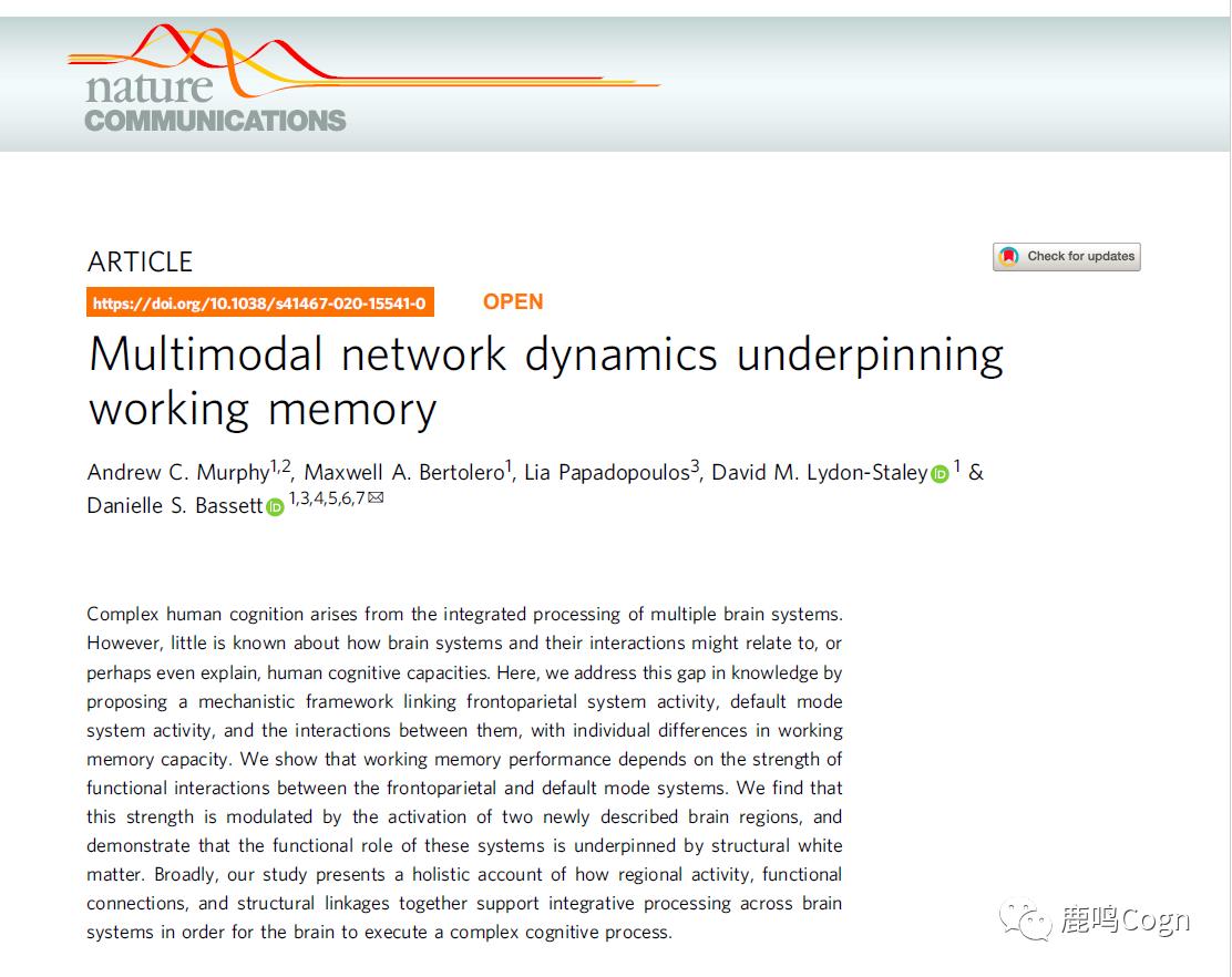 首先,利用一个四节点网络的动态模型(图3a),每个节点代表一个子网络,中间连线代表连接强度。为了构建脑活动的动态振荡行为,这里将每个节点都看做一个振荡器(oscillator;图3b),具体的模型构建可见原文Methods部分。图3 (A) 构建的四系统动态网络模型。DM(默认网络)、DA(背侧注意网络)、SN-A(额顶子网络A)、SN-B(额顶子网络B)是由4个振荡器或192个振荡器组成的系统;全脑是由400个振荡器组成的系统。(B)将各网络动态集成到6分钟的时间序列,与n-back任务的时间长度一致。四节点模型的结果表明,子网络A的活动增加与FPN和DMN之间连接呈正相关;子网络B的活动增加与两个网络间连接强度呈负相关(图3c)。由于四节点的模型太过简化,该结果能否推广到更复杂的网络中仍不清楚,因此研究者进一步利用了192个节点和400个节点的网络探索这个问题。在这两个模型中,四个系统均被分割到更细的脑区节点,结果表明,这两个模型的结果与之前的四个节点的模型是一致的(图3d/e)。图3(C~E)4节点、192节点、400节点模型中,子网络A/B活动强度与DMN和FPN间网络强度的关系之后,研究者又利用不同节点个数的动态模型分析了两个额顶子网络强度与DAN和FPN连接强度的关系,结果同样与实证研究结果一致,即子网络A的活动强度与FPN和DAN之间的功能连接强度负相关,子网络B的活动强度与FPN和DAN之间的功能连接强度正相关。综上所述,本研究先利用无监督的聚类分析将FPN区分成了两个不重叠的子网络,其一在功能上与DMN一致,其二与DAN功能上一致。这两个子系统的相对活动水平可以使FPN的功能与DMN或DAN的功能趋同。无论是结构连接还是功能连接,子网络A都与DMN的连接更紧密,子网络B与DAN连接更紧密。最后,无论是脑影像数据还是非线性动力系统建模,都表明两个子网络的强度可以不同方向影响FPN与DMN、FPN与DAN之间的功能连接强度。总之,在工作记忆任务中,FPN(而非DMN)可以部分控制着FPN与DMN之间的连接。本研究实际上关注的是脑网络功能组织方式,工作记忆任务只是一个载体。他们将FPN分为两个独立子网络的思想和Dixon等人(2018)在PNAS的文章一致,同时进一步做出了一些扩展。Murphy, A. C., Bertolero, M. A., Papadopoulos, L., Lydon-Staley, D. M., & Bassett, D. S. (2020). Multimodal network dynamics underpinning working memory. Nat Commun, 11(1), 3035. doi:10.1038/s41467-020-15541-0eLife | 额顶网络的动态整合支持了认知控制